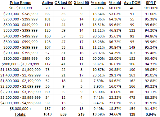 We like this metric, and compare it to the previous months to look for trends. Not just trends of more or less closed sales or expired listings, rather put into context as a percentage of the actual amount of active inventory listed for sale in the market. That context is very important to understand any target market data analysis.